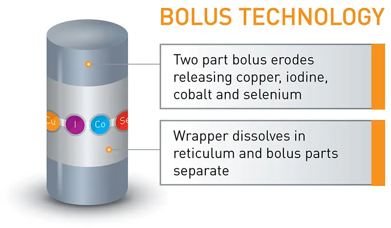 A sustained release bolus containing copper, iodine, cobalt and selenium. Intended for ruminating calves over 6 weeks of age with a liveweight of 100 – 200 kg, on grass or forage-based diets.